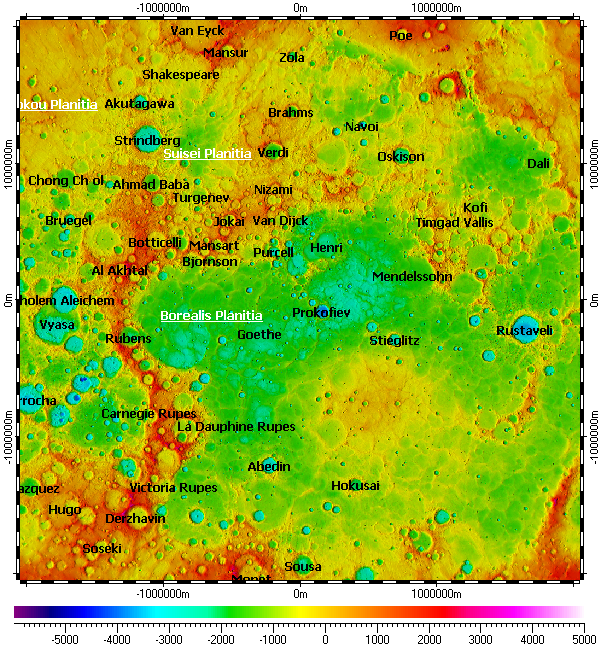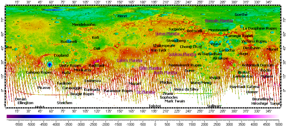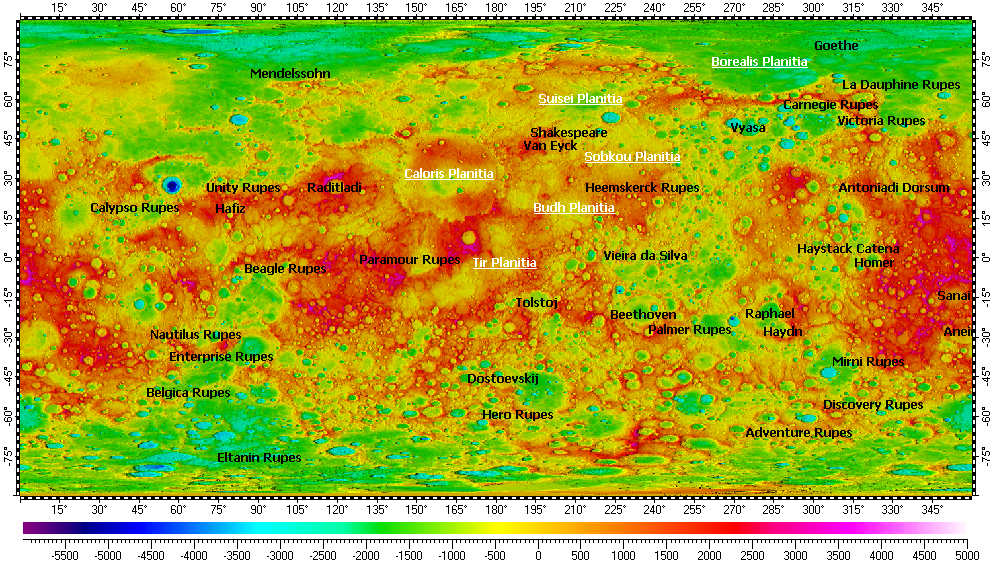 The map uses DEM on its background, derived from refactored data of Mercury Double Imaging System (MDIS) with resolution 665m.