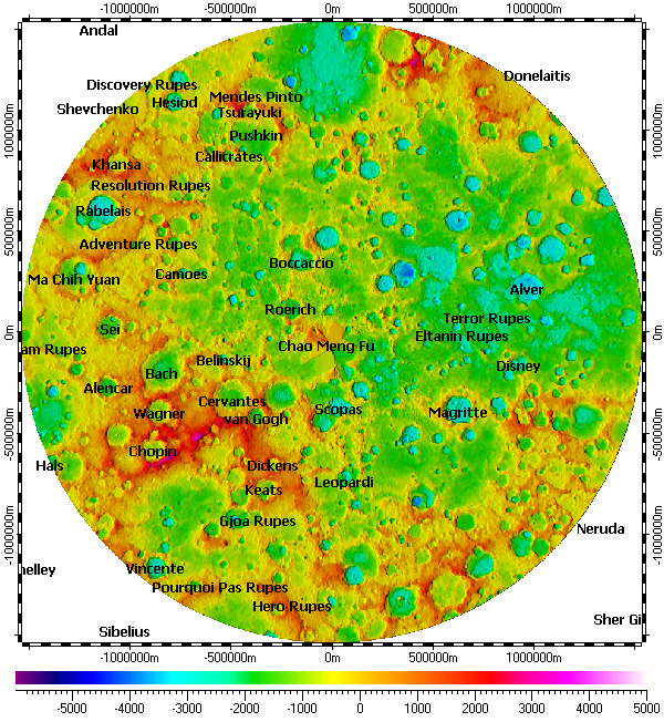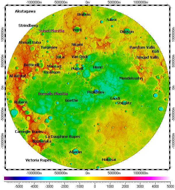The map uses DEM on its background, derived from data of MLA with resolutions from 1000m to 250m over common area.