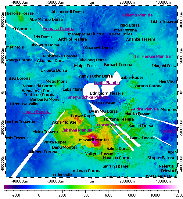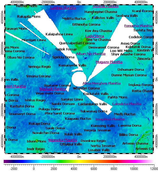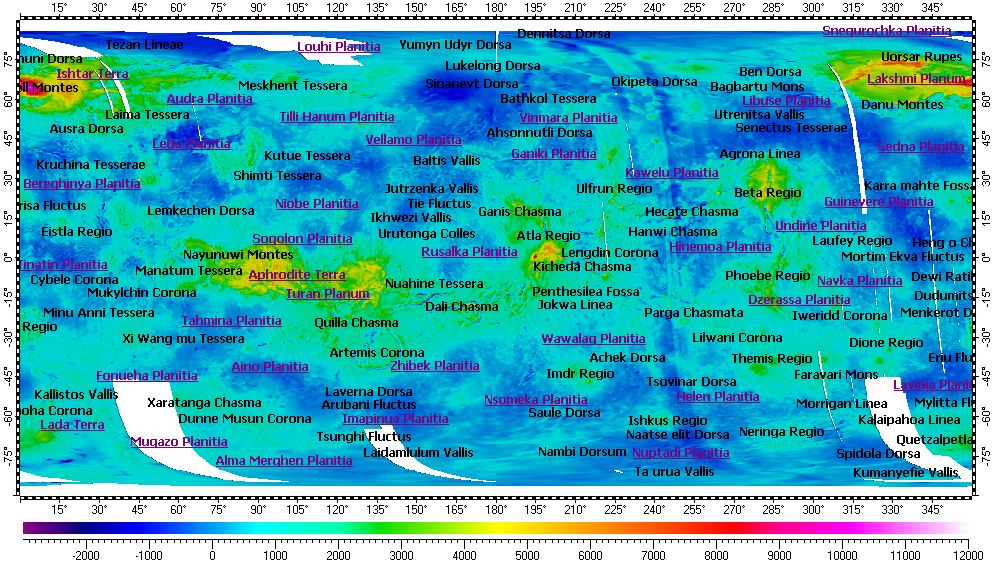 The map uses DEM on its background, derived from Global Topography Data Record of Magellan mission with resolution 4641m.